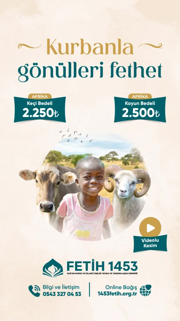 Kurban rabbimize yakınlaşma vesilemiz ve bağlılığımızın simgesi olarak bize Hz. İbrahim efendimizden miras kalan bir ibadet olan kurban toplumsal yardımşlaşma ve kardeşlik duygularını pekiştiren eşsiz biz ibadettir. Yüce kitabımız Kur’an-ı Kerim de Biz her ümmete bir kurban ibâdeti belirledik ki, kendilerine rızık olarak verdiğimiz hayvanları kurban ederken üzerlerine Allah’ın adını ansınlar. Şunu iyi bilin ki, sizin ilâhınız tek bir ilâhtır; öyleyse artık O’na teslim olun. Buyurulmaktadır. Fetih 1453 derneği ibadet şuuruyla kurban bağışı emanetlerinizi yurtiçi ve yurtdışında ihtiyaç sahibi aile yoksul ve kimsesizlere ulaştırıyor.